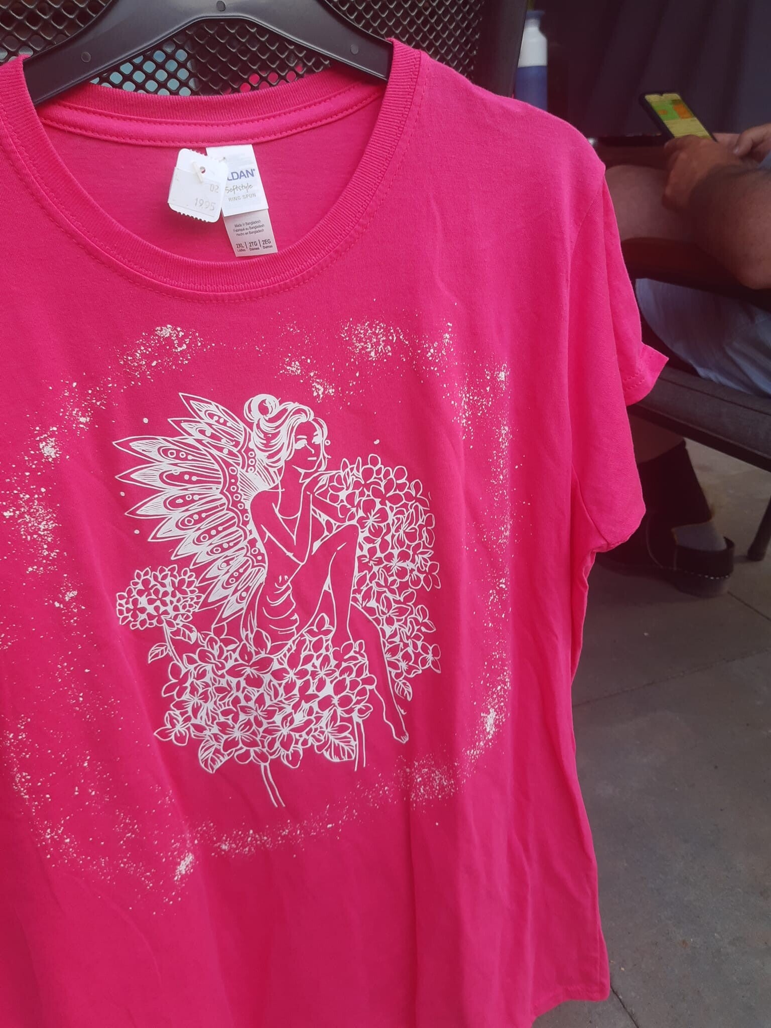 Mooi roze shirt met witte opdruk, van een vrouw met bloemen